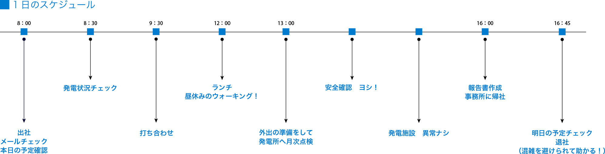 主な業務は23カ所ある太陽光発電所と1カ所の風力発電所が、毎日きちんと発電するように、運転状態をチェックしメンテナンスをしていく仕事です。