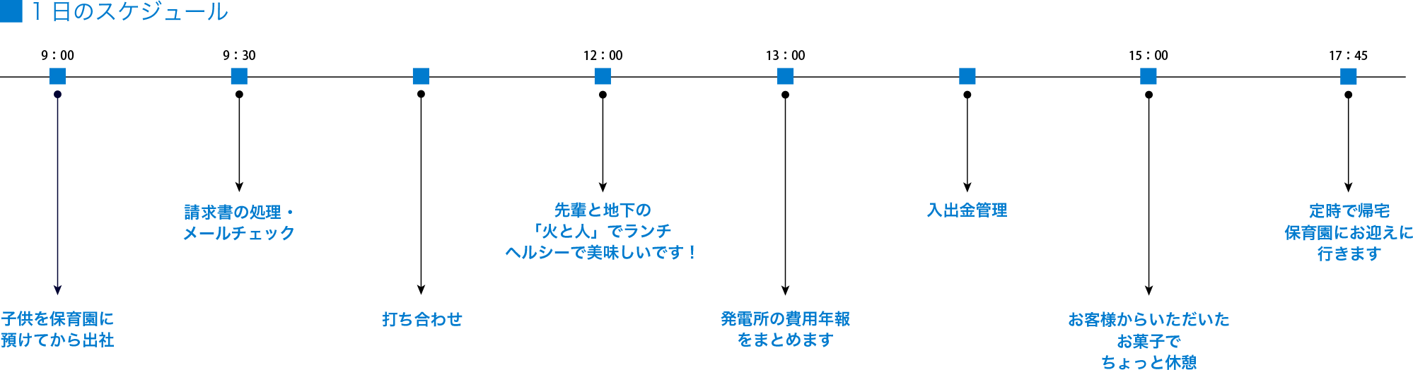 主に経理業務で会計を担当しています。また、発電所毎の費用報告等の資料作成も行っています。